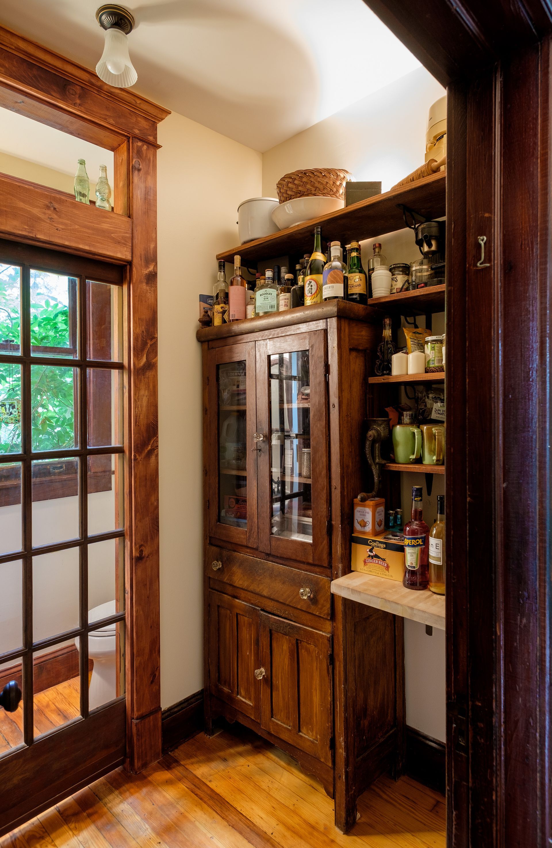 This charming but shabby kitchen in a century-old house in Baltimore City was full of character but lacked functionality. Next to it was a full pantry that needed renovation, and the client asked that a new powder room be carved out of the existing space while leaving as much storage area as possible. The design for this renovation was focused on retaining and enhancing the architectural interest of the original kitchen and improving its layout. The only redeemable feature of the original pantry was its large window, so when the new powder room was added, a sliding glass door — repurposed from an old door found in the basement — was used to bring daylight into the new pantry space. The new kitchen is a delightful blend of new and old.