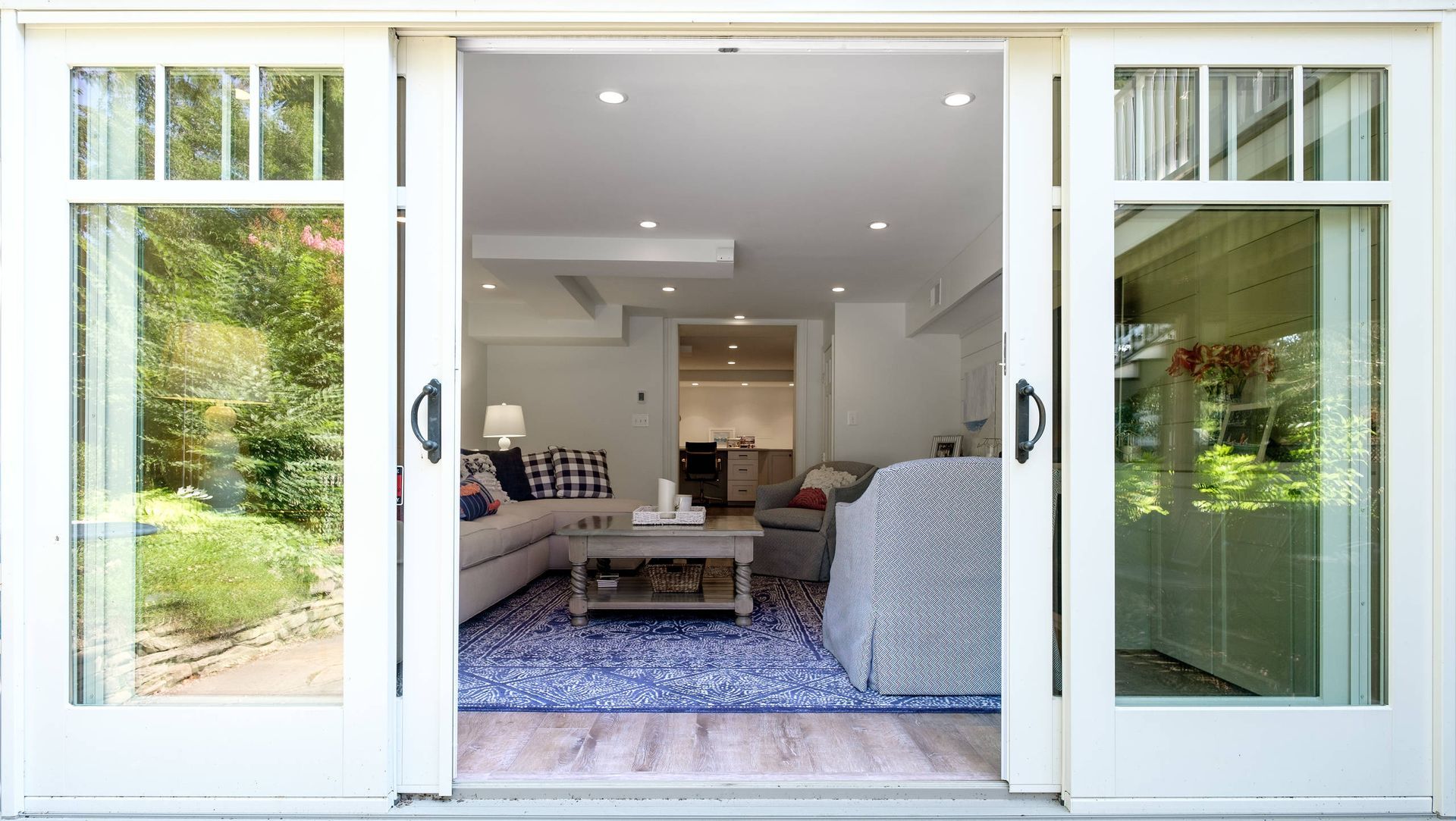 Previous renovations had made the existing attached garage for this Baltimore County house obsolete. The owners had used the space as a makeshift TV room and storage but wanted to make the space more pleasant and open to the adjacent finished basement. Replacing the overhead garage door with sliding glass doors and enlarging the doorway from basement to garage were the first steps toward creating a beautiful, comfortable family room, complete with fireplace.