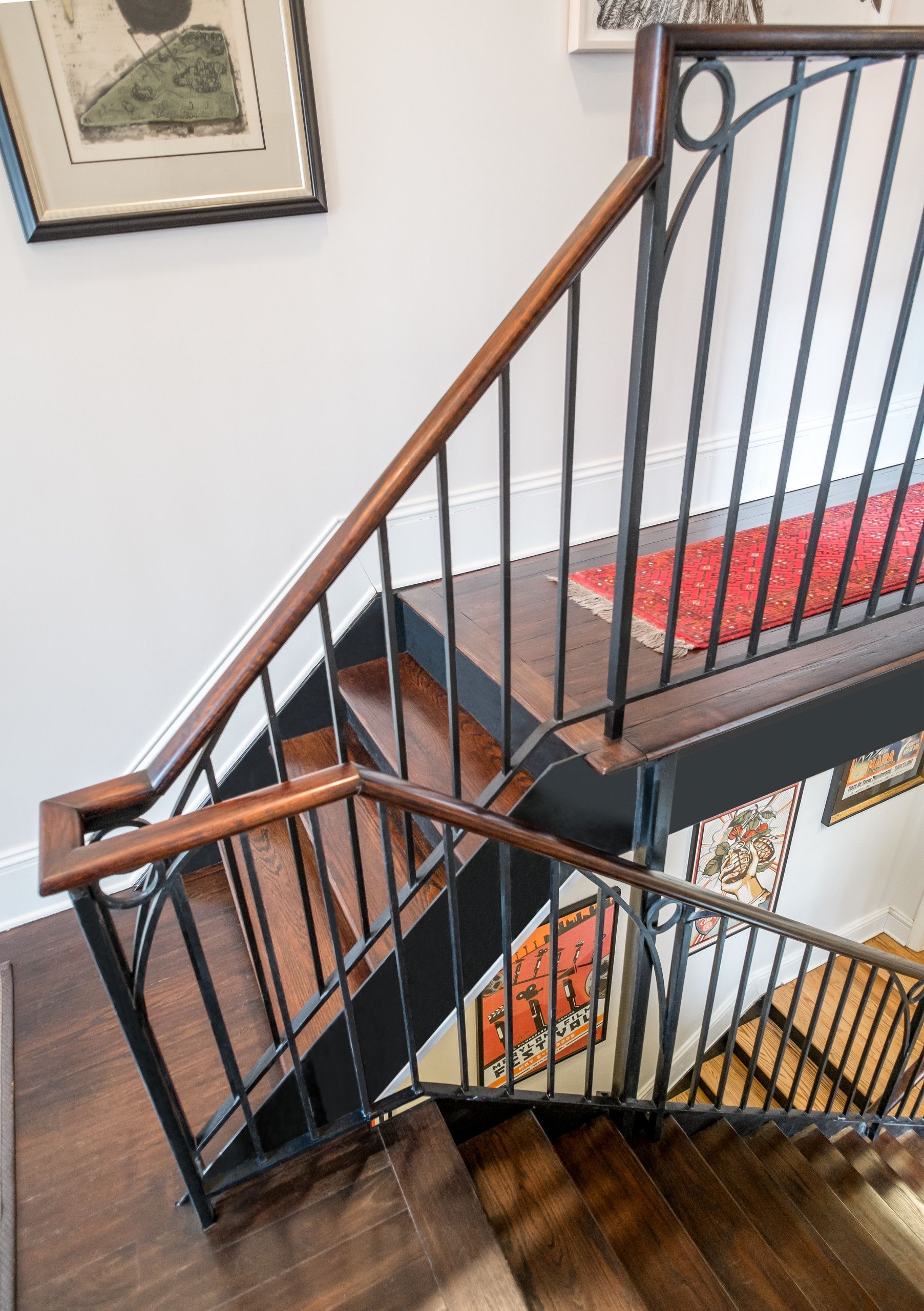 The owners had purchased a 150-year old house in downtown Baltimore that was four stories and divided into separate apartments. Their goal was to combine two of the apartments into one owner's unit and the only way to do this was by building a new internal stairway between two floors. The challenge was that structurally the only place where the stairs could go was adjacent to an addition that had been built many years ago where the floors intentionally did not align by 4 feet. In other words, the stairway needed to incorporate three runs of stairs among four separate levels between the two floors they needed to join. They wanted to accomplish this while retaining the light, loft-like look they had throughout the rest of the house.