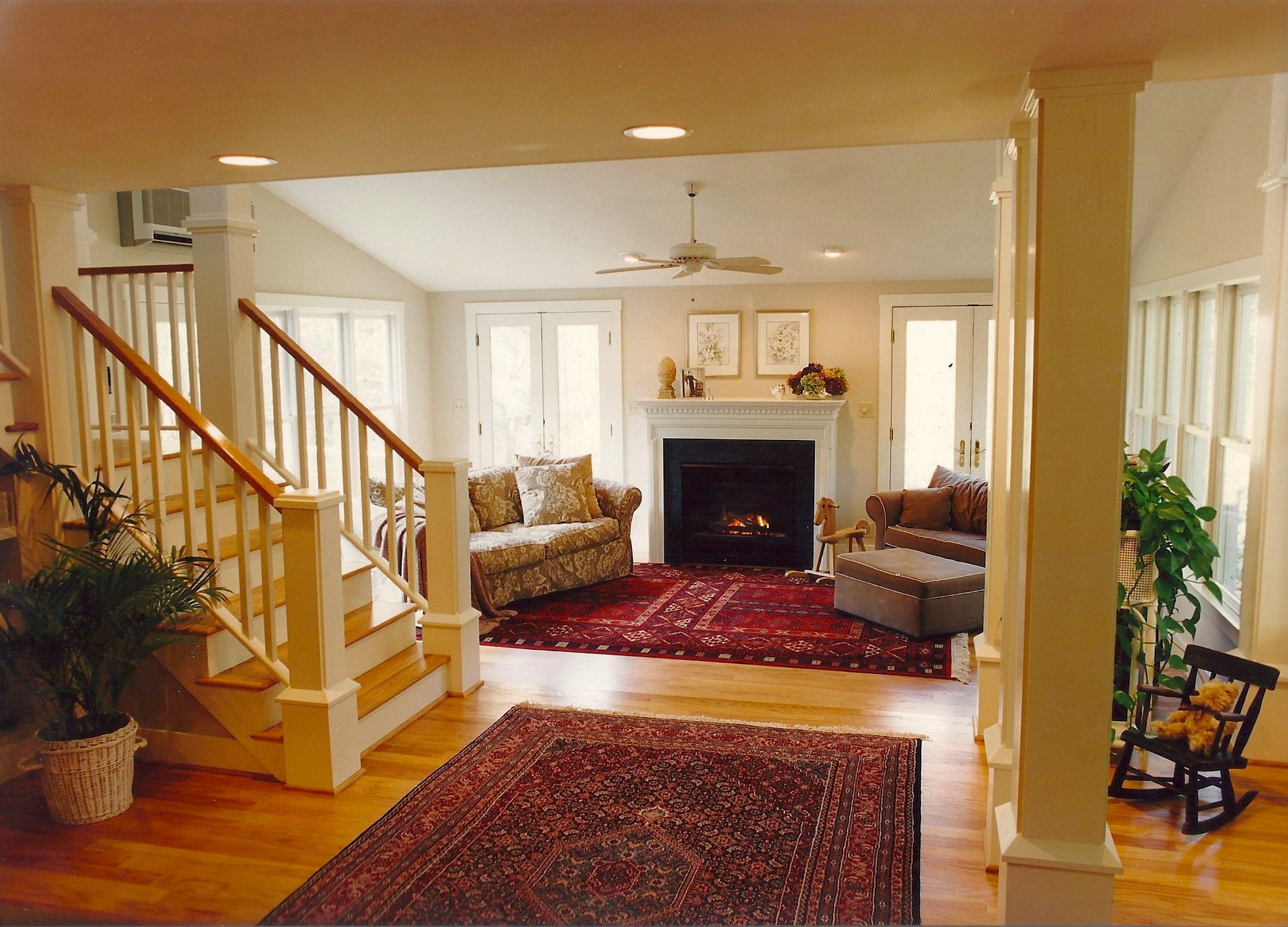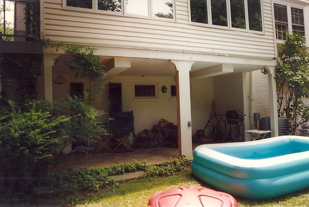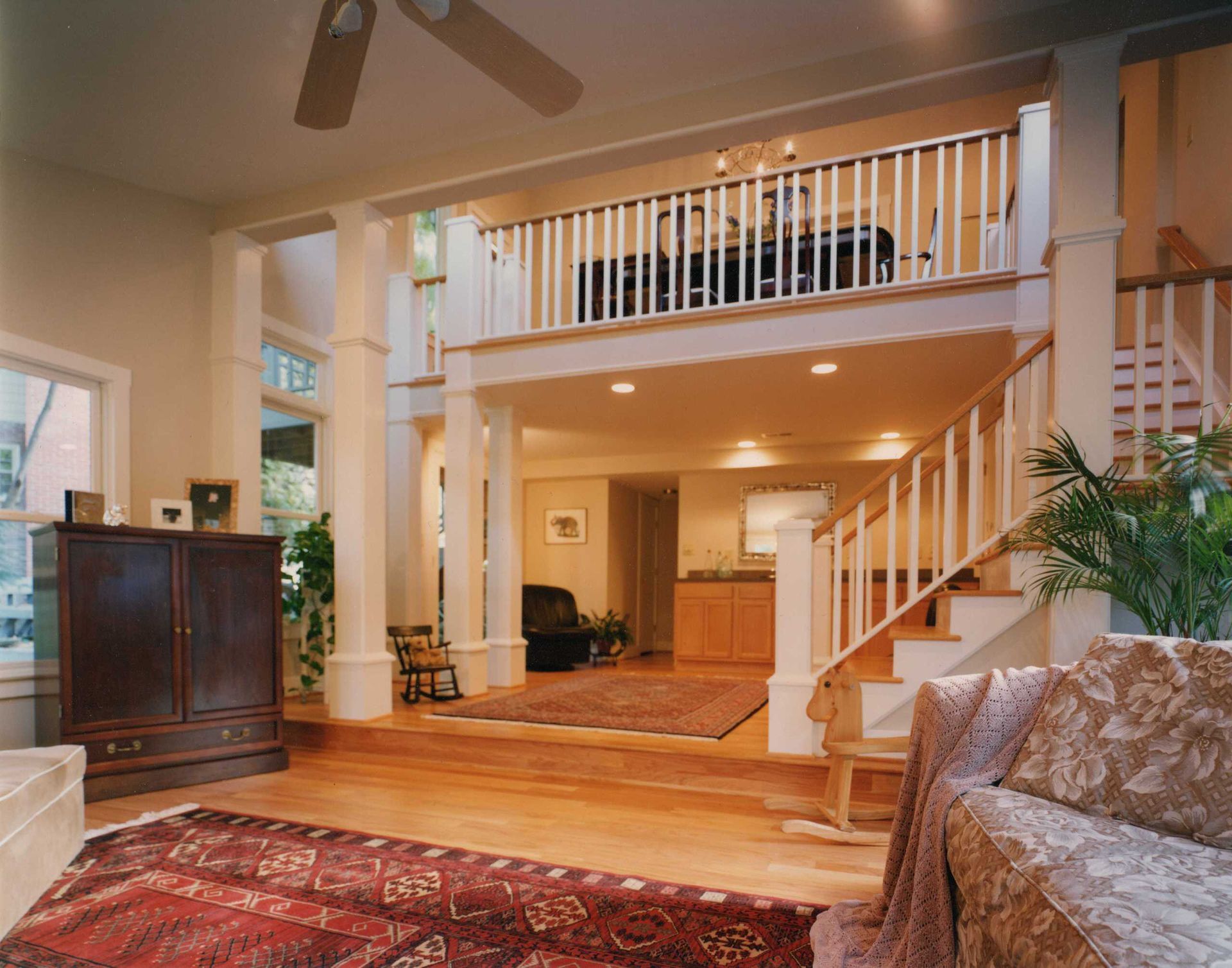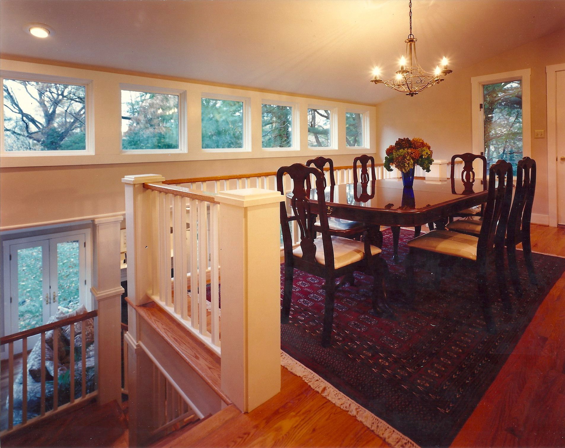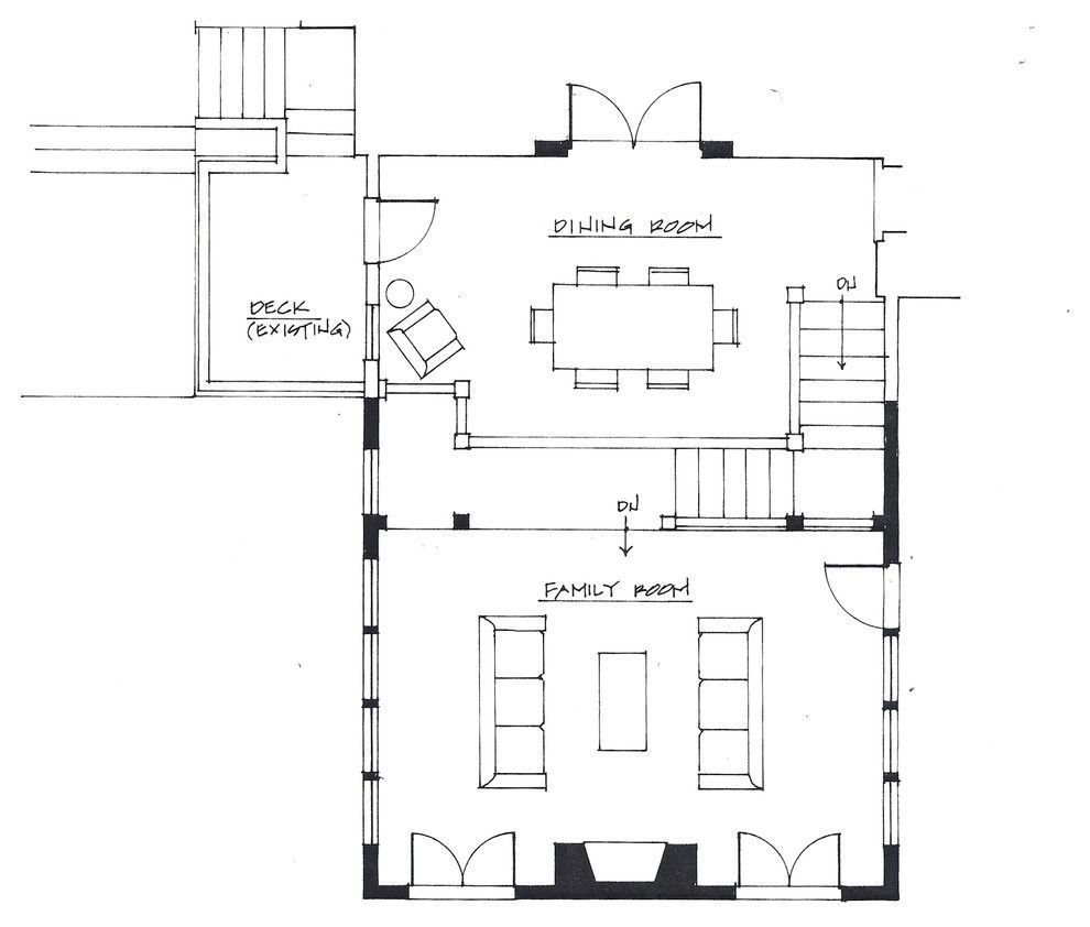 The young family who owned this house needed a family room addition for their growing brood. However, the site is so steeply sloped that the main floor is an entire level above grade at the rear. The parents were concerned that they would not be able to keep an eye on their young children while they were playing. Solution? The existing TV room was converted to a dining room loft overlooking the new family room so Mom and Dad could just poke their heads out of the adjacent kitchen and check on the kids below.